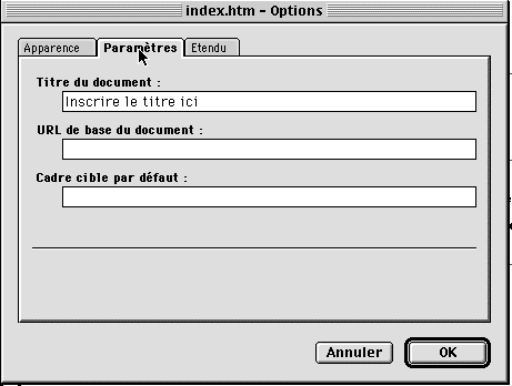 Cliquez sur l'onglet Paramètres et écrivez le titre du document dans la première case. Ce titre sera affiché dans la barre des titres. Si vous n'avez pas entré ce titre, Claris Home Page vous le demandera lors de l'enregistrement du fichier. ATTENTION. Ce titre n'est pas soumis aux règles des noms de fichiers HTML. Il sera par contre proposé comme nom de fichier lors de l'enregistrement. Assurez-vous donc de bien nommer votre fichier à la sauvegarde.